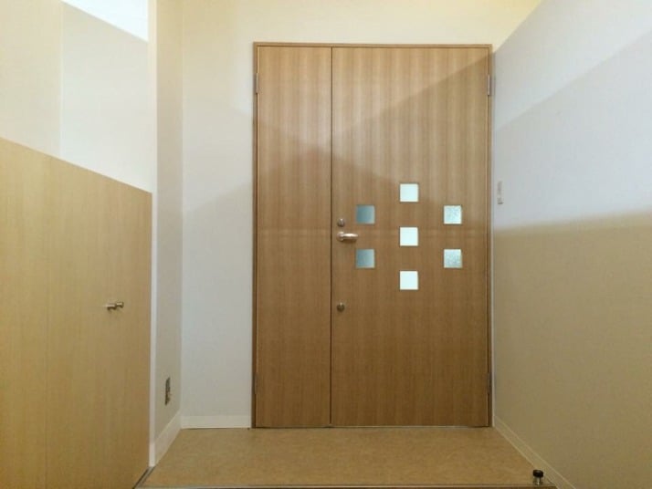 小窓が7つお洒落に配置された親子ドアとフラッシュドアです